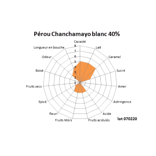 Ce chocolat commence en douceur avec des arômes de lait chaud et de vanille suivis de notes de jasmin, de fruits jaunes et de framboise.